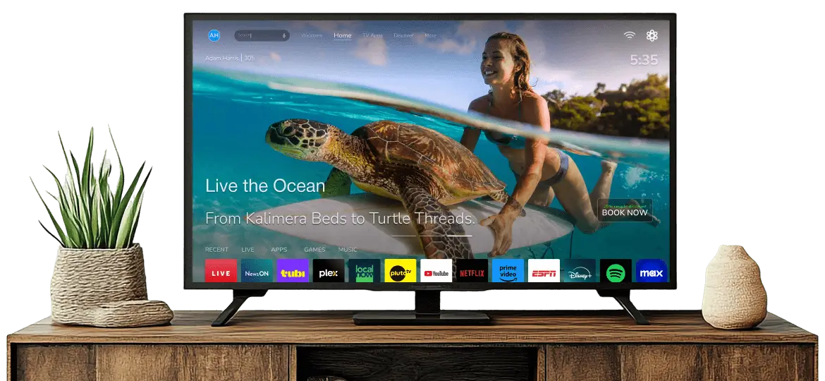 Turn every in-room screen into a personalized, revenue-driving experience — combining streaming, branding,